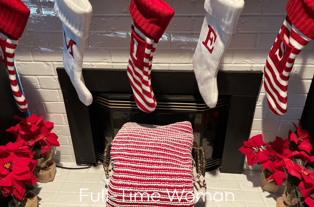 When my family and I moved into our new home this spring the first thing we did was paint. I knew I wanted the fireplace to be white so my daughter and I literally stayed up all night painting until it was right. We had no idea it would turn out so perfect. Of course back then visions of Christmas stockings neatly placed across the mantle danced through my head. Today, they are a bright red, candy cane knit pattern hung over the fireplace with care just above strategically placed poinsettias and a soft, warm throw blanket.